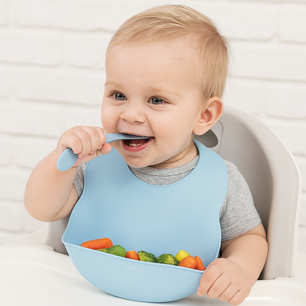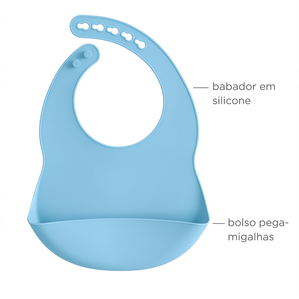 Feito em 100% silicone macio, ele é super higiênico, fácil de limpar e ideal para acompanhar o bebê em todas as fases da introdução alimentar. Seu design inteligente conta com um bolso pega-migalhas profundo, que evita sujeira na roupa e no chão, garantindo refeições mais tranquilas em casa ou fora dela.