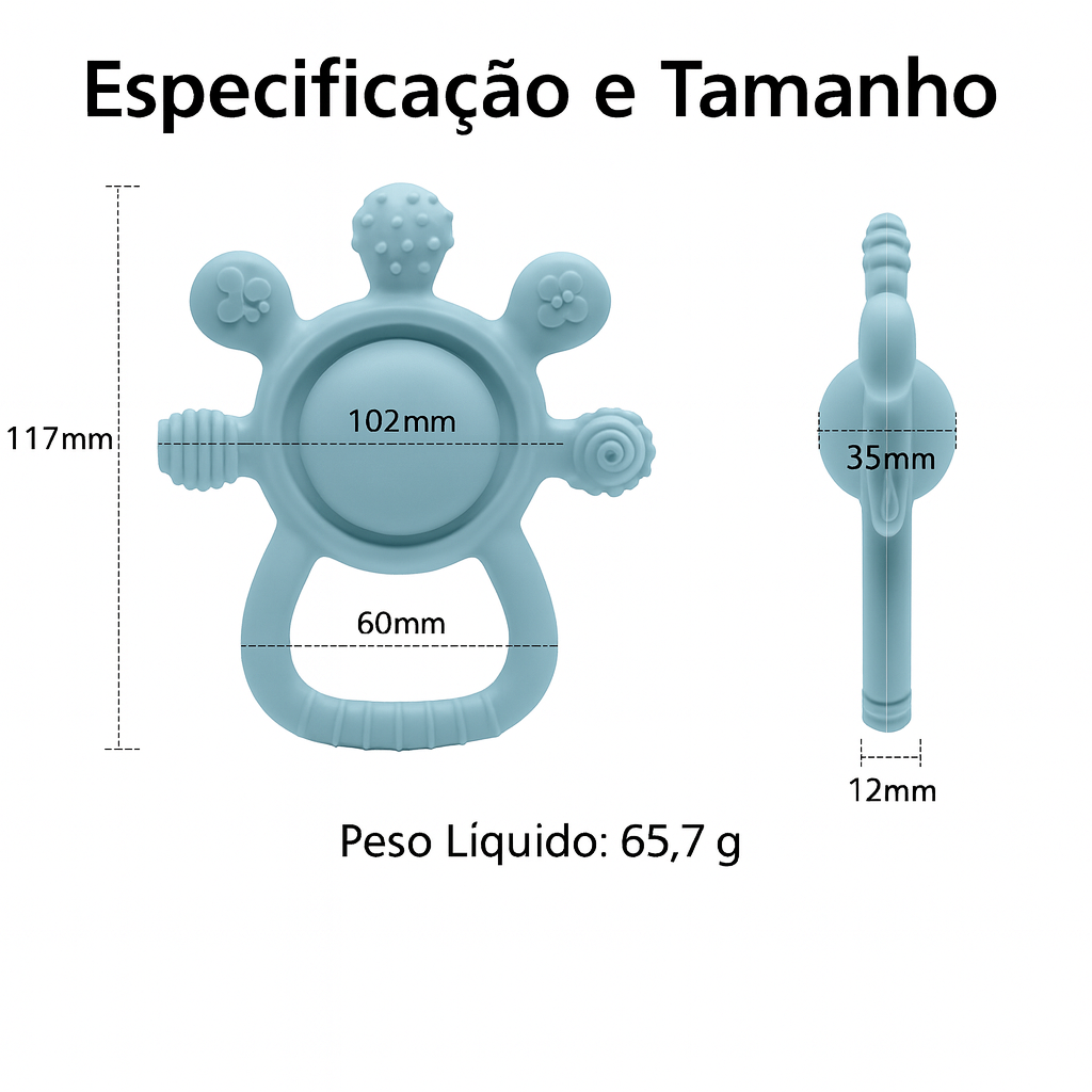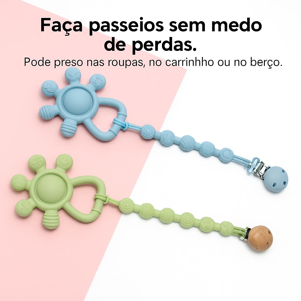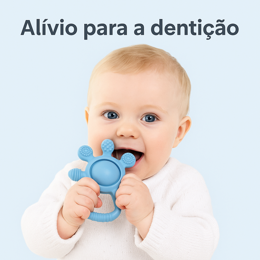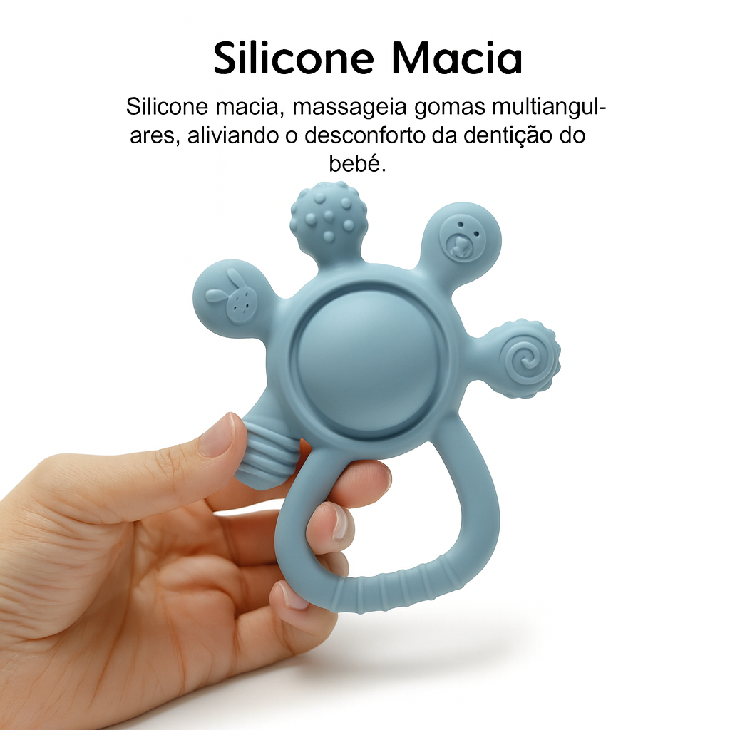 “O silicone é macio e dá pra ver que é seguro. Fácil de limpar e ele adora o barulhinho leve do chocalho.” – Amanda P. (BA)