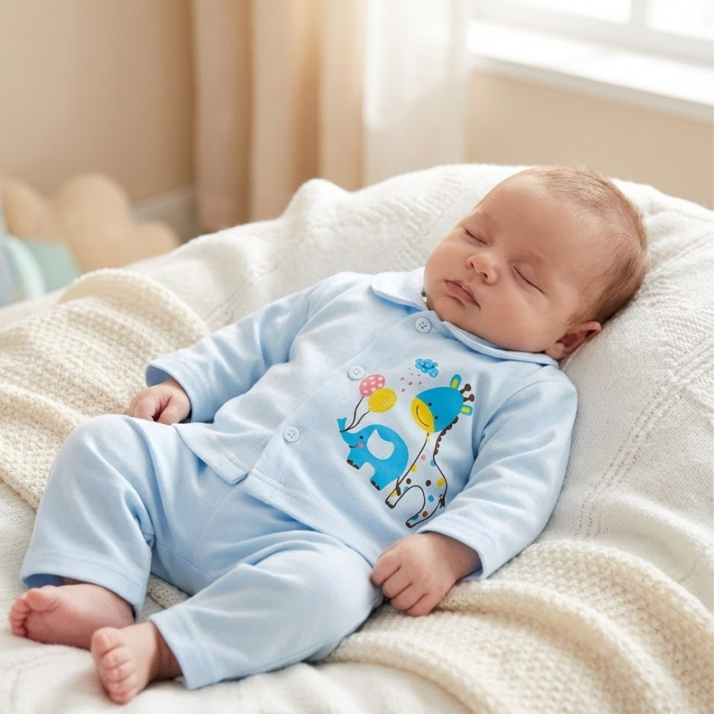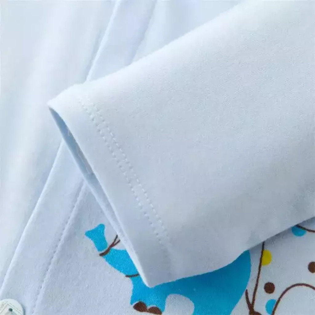 Produzido em algodão macio e respirável, o kit oferece toque suave e confortável para a pele sensível do recém-nascido.
