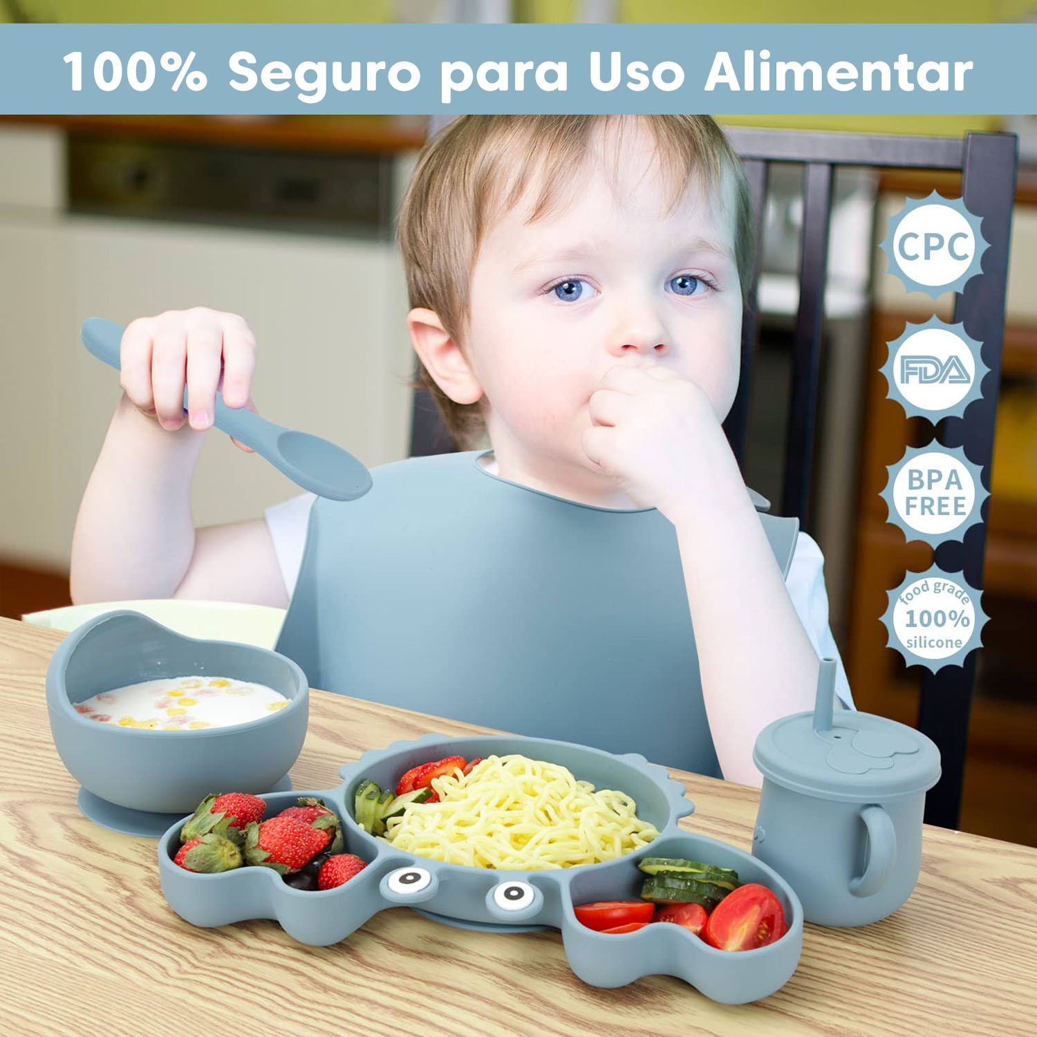 Desenvolvido com silicone alimentar seguro, macio e resistente, este conjunto foi criado para tornar a introdução alimentar muito mais tranquila — para a mamãe e para o bebê.
