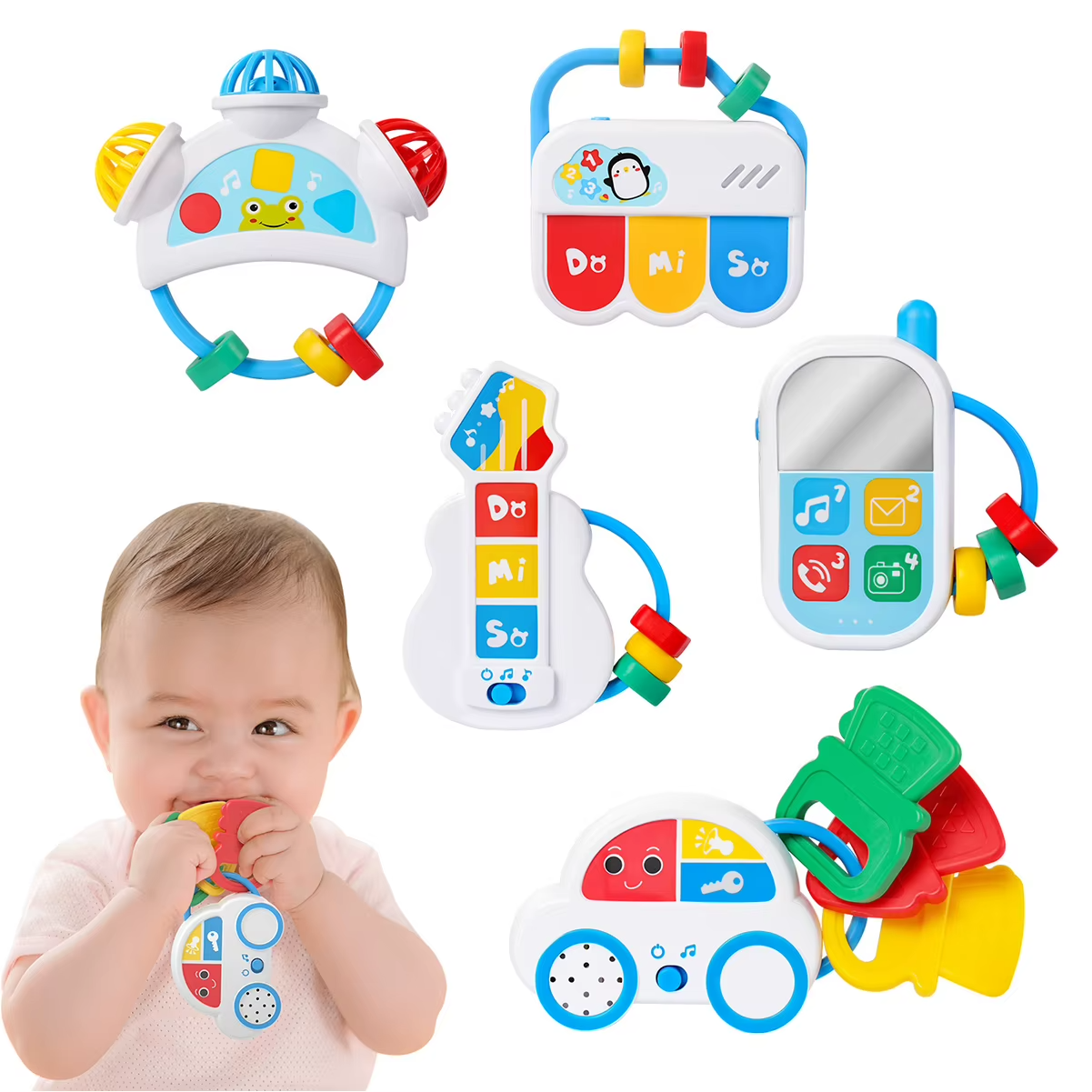Com sons alegres, texturas variadas e cores vibrantes, cada brinquedo foi criado para acompanhar o crescimento do seu bebê — desde os primeiros toques até as primeiras notas musicais.