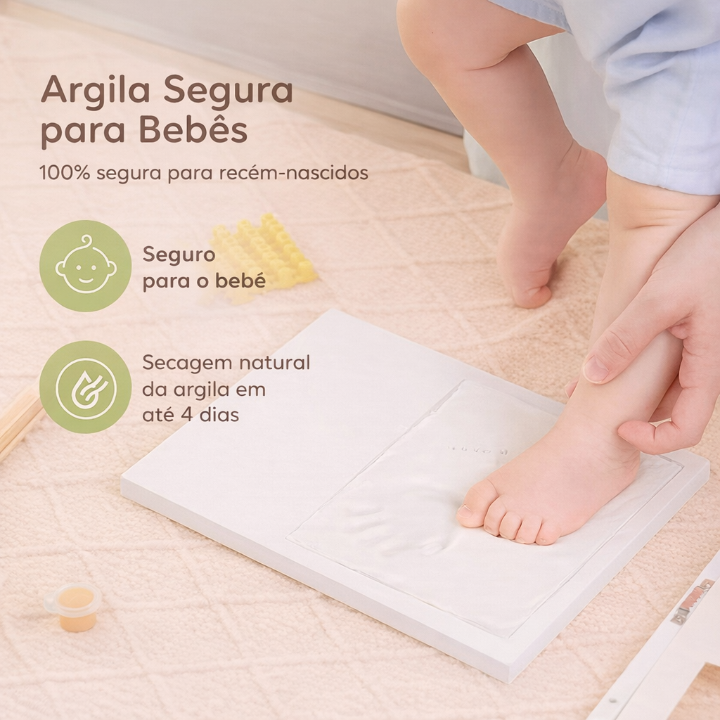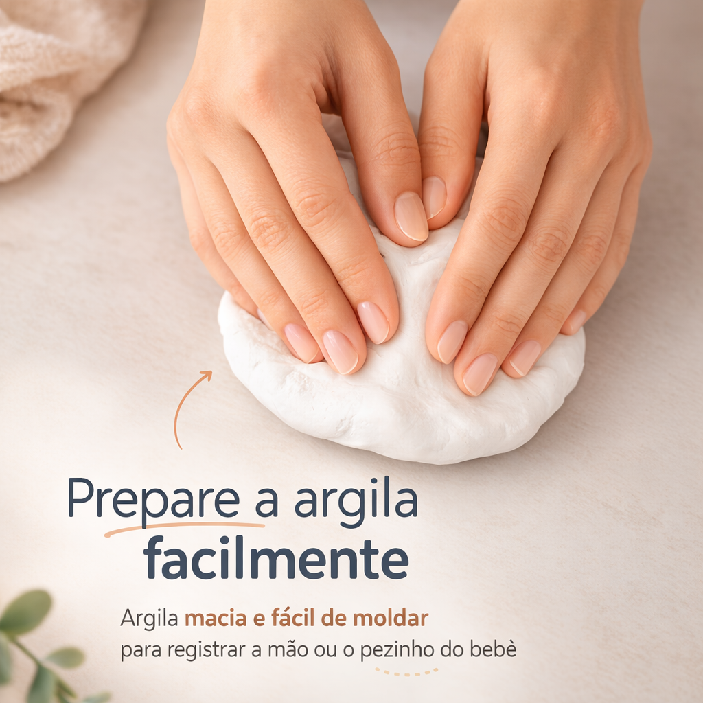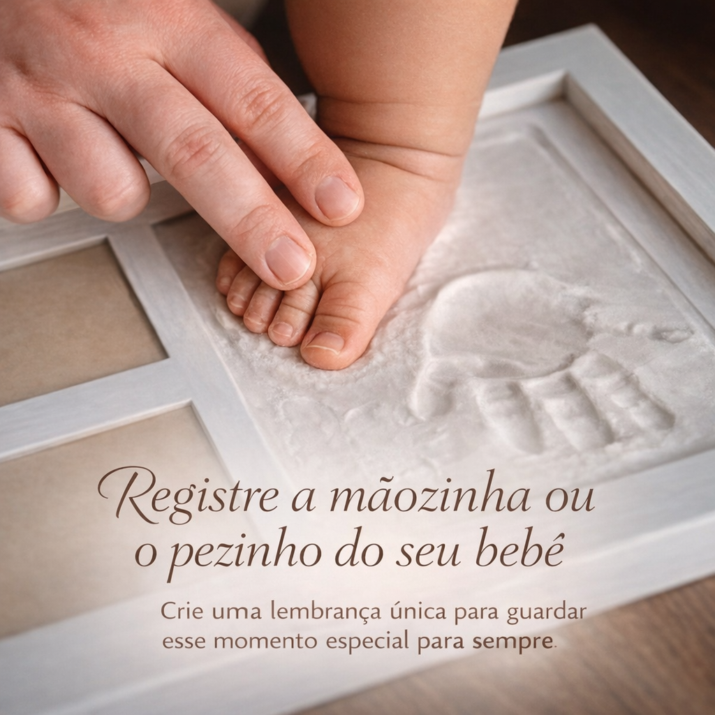 Esse kit foi pensado para transformar um momento simples em uma memória eterna. Em poucos minutos você prepara a argila, faz a impressão da mão ou do pezinho do bebê e cria um quadro delicado para decorar o quarto ou qualquer ambiente da casa.