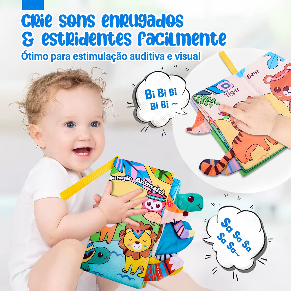 👶 Estimula os sentidos: texturas diferentes, papel amassado e som de “bibi” que desenvolvem audição e tato.